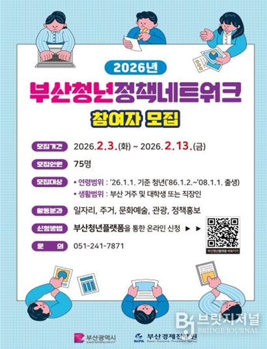 브릿지저널 윤나영 기자 | 부산시는 청년의 시정 참여 확대와 청년 주도의 정책 형성을 위해 '2026년 부산청년정책네트워크에 참여할 청년 75명을 오늘(3일)부터 2월 13일까지 공개 모집한다고 밝혔다.