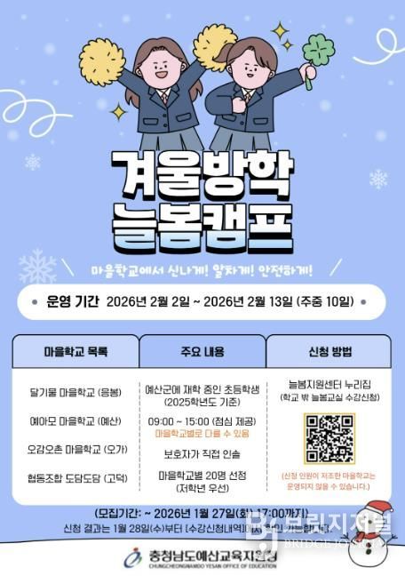 해당 늘봄학교는 예산군에 재학 중인 초등학생을 대상으로 2월 3일부터 14일까지 10일간 마을학교 형태로 진행되며, 마을별 특성을 반영한 돌봄·체험 중심 프로그램과 체계적인 안전 관리를 통해 학부모의 돌봄 부담을 덜어줄 계획이다.