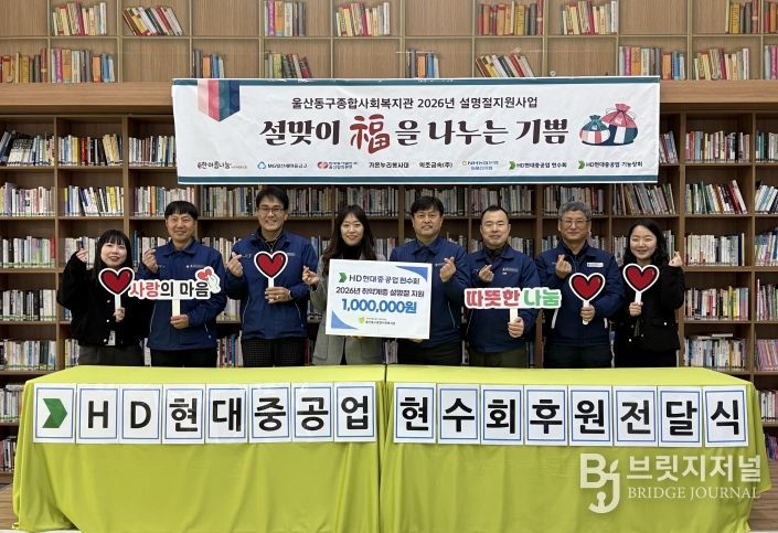브릿지저널 윤나영 기자 | HD현대중공업 현수회(회장 오정철)는 지난 2월 2일 월요일 오후 18시 다가오는 민족 대명절 설을 앞두고 온정 가득한 지역사회 나눔 실천에 앞장서고자 울산동구종합사회복지관(관장 남혜진)을 찾아 후원금 100만원을 전달했다.