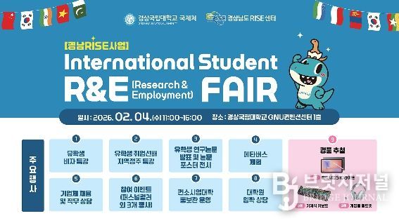 브릿지저널 김경미 기자 | 경상국립대학교2월 4일 가좌캠퍼스 GNU 컨벤션센터에서 경남 라이즈(RISE) 사업의 일환으로 ‘유학생 전용 연구·취업박람회(International Student R·E(Research · Employment) Fair)’를 개최한다. 이 행사는 외국인 유학생만을 위한 행사로 경남지역 대학 유학생은 모두 참여할 수 있다.