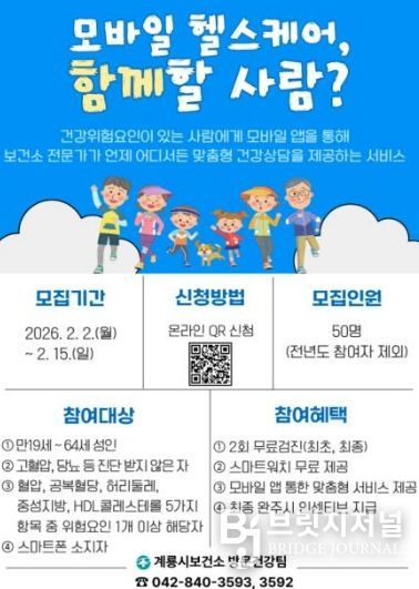 브릿지저널 정보영 기자 | 충남 계룡시는 시민의 자발적인 건강관리 지원을 위해 오는 15일까지 ‘모바일 헬스케어’ 사업 참여자 50명을 모집한다고 밝혔다.