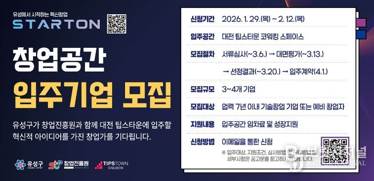 최종 선정된 기업은 대전 팁스타운 내 공간을 이용할 수 있으며, 임차료를 지원받는다. 이와 함께 유성구와 창업진흥원이 추진하는 상담·멘토링과 각종 창업 지원 사업에 참여할 기회도 제공된다.