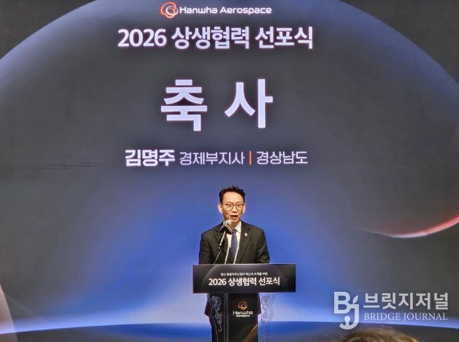 브릿지저널 김경미 기자 | 경상남도는 3일 오후 한화에어로스페이스 창원3사업장 R&D센터에서 열린 ‘한화에어로스페이스 2026 상생협력 선포식’에 참석해 방위산업 분야 대·중소기업 상생협력 확산을 위한 민·관 협력 의지를 재확인했다.