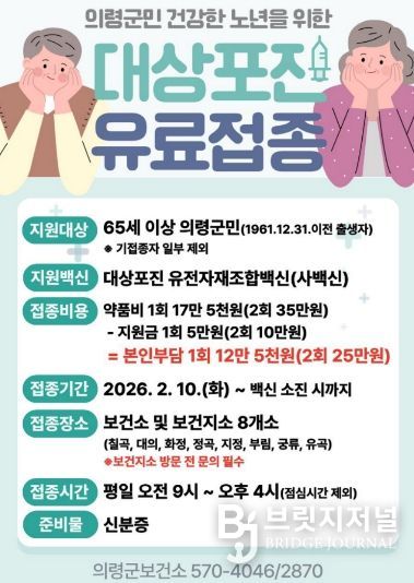 브릿지저널 김경미 기자 | 의령군은 10일부터 65세 이상 의령군민을 대상으로 대상포진 예방접종 지원사업을 시행한다고 4일 밝혔다.