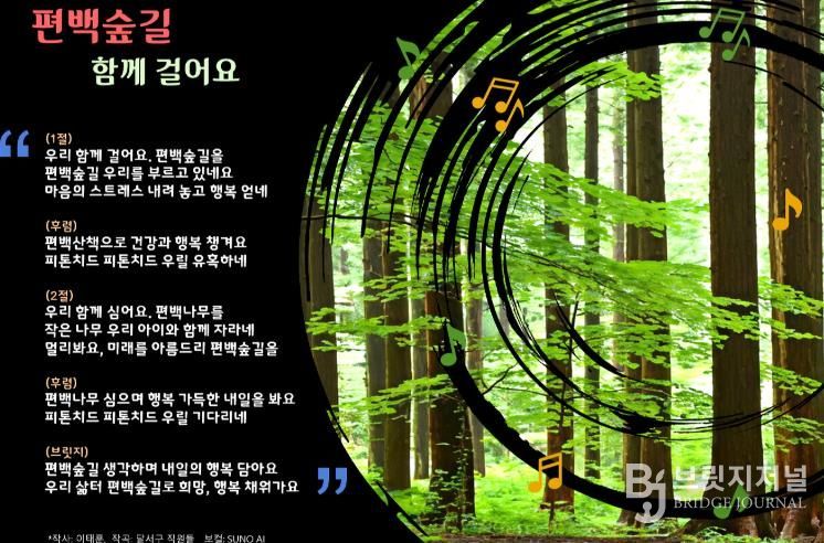 후렴구에는 ‘편백산책으로 건강과 행복 챙겨요’, ‘피톤치드 우릴 유혹하네’라는 메시지를 경쾌한 리듬에 담아, 편백숲이 주는 상쾌함과 치유의 가치를 자연스럽게 전달한다.