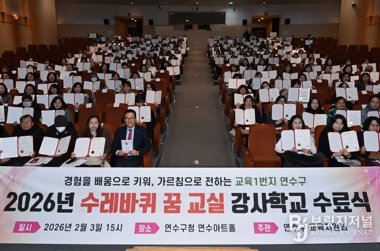 브릿지저널 김경미 기자 | 연수구는 지난 3일 구청 연수아트홀에서 ‘2026년 수레바퀴 꿈 교실 강사학교’ 수료식을 성황리에 개최했다.