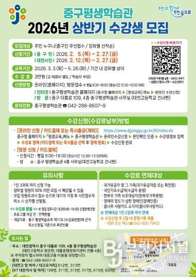 브릿지저널 정보영 기자 | 대전 중구는 2월 5일부터 2026년 상반기 중구 평생 학습관 프로그램 수강생을 선착순 모집한다고 밝혔다.