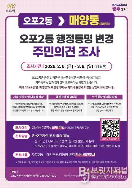 브릿지저널 김경미 기자 | 광주시 오포2동은 지역 정체성을 반영한 행정동 명칭 변경을 위해 2월 6일부터 3월 8일까지 오포2동 전 세대를 대상으로 주민 의견 조사를 실시한다고 4일 밝혔다.