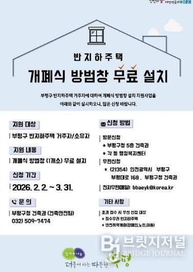 브릿지저널 김경미 기자 | 부평구가 오는 3월 31일까지 지역 내 반지하주택을 대상으로 ‘2026년 개폐식 방범창 설치 지원사업’ 신청을 받는다고 밝혔다.