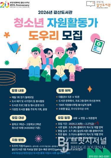 브릿지저널 김경미 기자 | 부평구립 갈산도서관은 오는 27일까지 청소년 자원활동가 ‘도우리’를 모집한다고 밝혔다.