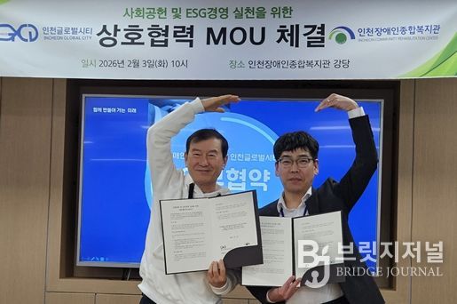 브릿지저널 김경미 기자 | 인천시사회서비스원 소속 인천시장애인종합복지관은 최근 ㈜인천글로벌시티와 손잡고 지역사회 장애인 복지 증진에 나선다고 4일 밝혔다.