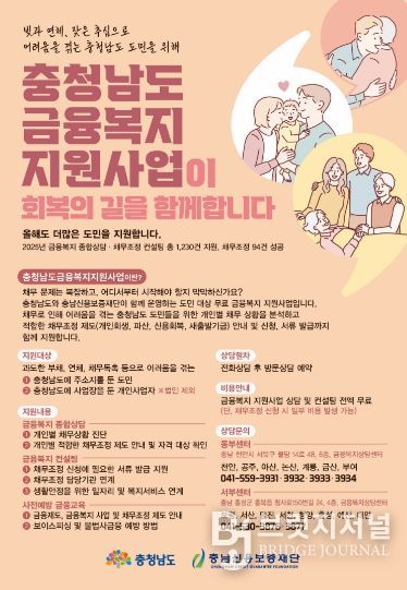 브릿지저널 정보영 기자 | 충남도는 채무 문제로 어려움을 겪고 있는 도민을 위해 충남신용보증재단과 함께 ‘충남 금융복지 지원사업’을 추진한다고 5일 밝혔다.