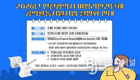 브릿지저널 김경미 기자 | 인천광역시는 비영리민간단체의 공익활동을 활성화하고 원활한 사업 참여를 지원하기 위해 '2026년 인천광역시 비영리민간단체 공익활동 지원사업 설명회'를 오는 2월 10일 개최한다고 밝혔다.