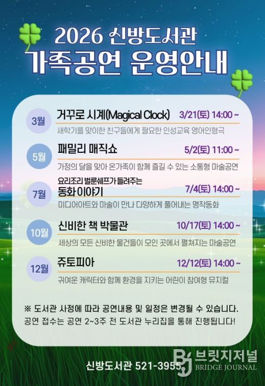 브릿지저널 정보영 기자 | 천안시 신방도서관은 가족특화도서관의 특성을 살려 연중 온 가족이 함께 즐길 수 있는 ‘2026 가족 공연’ 프로그램을 운영한다고 5일 밝혔다.