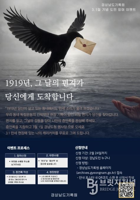 브릿지저널 김경미 기자 | 경상남도기록원은 제107주년 3·1절을 앞두고 체험형 기록 이벤트 ‘1919년, 그날의 편지가 당신에게 도착합니다’를 운영하고, 2월 한 달간 참여 접수를 진행한다.