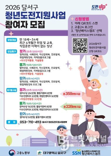 브릿지저널 김진석 기자 | 대구 달서구는 청년들의 자신감 회복과 취업 의지 제고를 위해 ‘청년도전지원사업’을 6년 연속 추진하며, 올해도 참여자를 모집하고 있다.