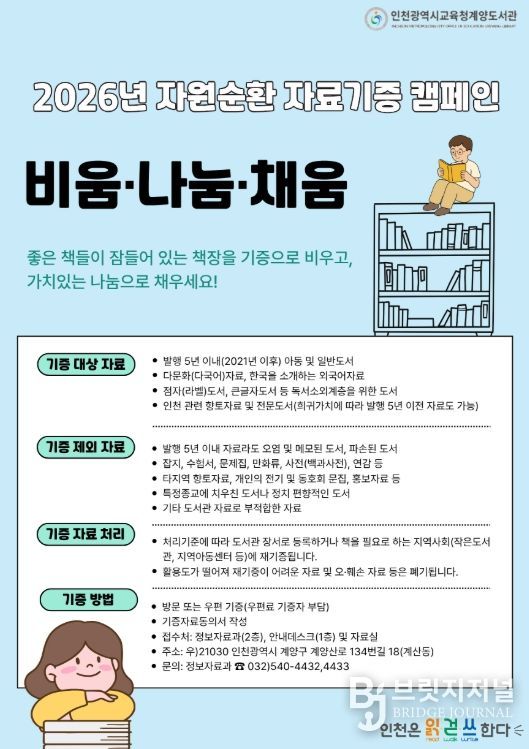 브릿지저널 김경미 기자 | 인천광역시교육청계양도서관은 시민과 지역사회가 함께하는 자원순환형 독서문화 확산을 위해 2026년 자료기증 캠페인 ‘비움·나눔·채움’을 연중 운영한다고 5일 밝혔다.