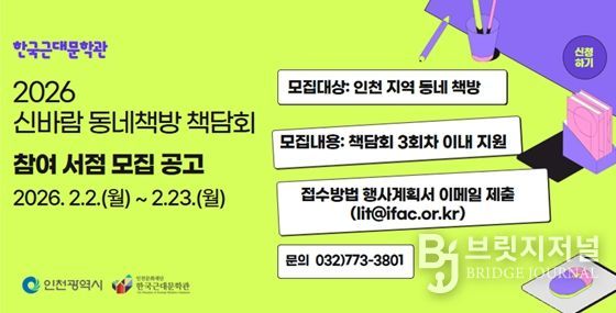 브릿지저널 김경미 기자 | 인천문화재단 한국근대문학관은 인천 지역 동네책방과 함께하는 2026년 '신바람 동네책방 책담회' 참여서점을 모집한다.