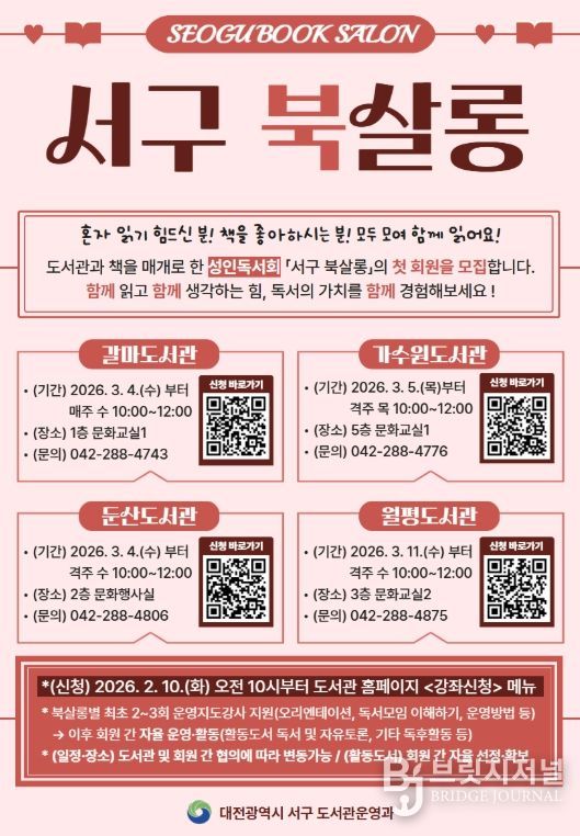 브릿지저널 정보영 기자 | 대전 서구 4개 공공도서관(갈마, 가수원, 둔산, 월평)은 주민들을 대상으로 책과 도서관을 매개로 한 성인 독서회 ‘서구 북살롱’을 운영한다고 5일 전했다.