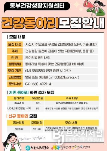 한편, 건강 동아리 모집에 대한 사항은 서산시 동부건강생활지원센터에 문의하면 된다.