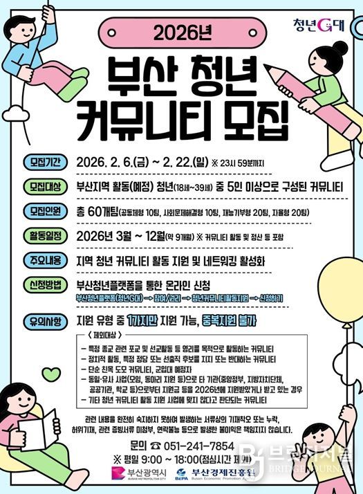 브릿지저널 윤나영 기자 | 부산시는 오늘(6일)부터 2월 22일까지 '2026년 청년 커뮤니티 활동 지원 사업' 참여팀을 모집한다고 밝혔다.
