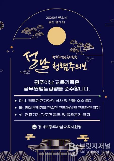 브릿지저널 김경미 기자 | 경기도광주하남교육지원청은 2월 9일, 2026년 병오년 설명절을 맞아 관내 교직원들이 청렴한 마음가짐으로 새해를 시작할 수 있도록‘교육장 청렴서한문’과‘청렴주의보’를 각급 학교에 전달했다.