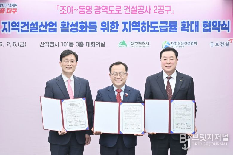 브릿지저널 김진석 기자 | 대구광역시는 2월 6일오후 2시 시청 산격청사에서 ‘조야~동명 광역도로건설 2공구’ 공사에 수반되는 하도급의 지역업체 참여 비율 확대를 위해 금호건설㈜, 대한전문건설협회 대구시회와 3자 협약을 체결했다.