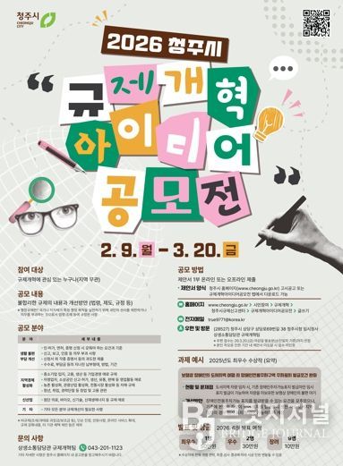 브릿지저널 김경미 기자 | 청주시는 시민이 체감할 수 있는 다양하고 창의적인 규제개혁 아이디어를 발굴해 일상생활과 경제활동을 제약하는 규제를 적극 개선하고자 ‘2026 청주시 규제개혁 아이디어 공모전’을 개최한다고 8일 밝혔다.