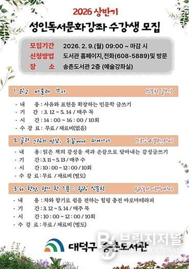 브릿지저널 정보영 기자 | 대전 대덕구 송촌도서관은 새봄을 맞아 오는 3월부터 성인을 대상으로 한 독서문화강좌를 운영한다.