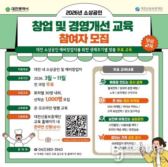 브릿지저널 정보영 기자 | 대전시는 예비창업자와 소상공인의 경영 역량 강화를 위해 ‘2026년 창업 및 경영개선 교육’참여자를 모집한다.