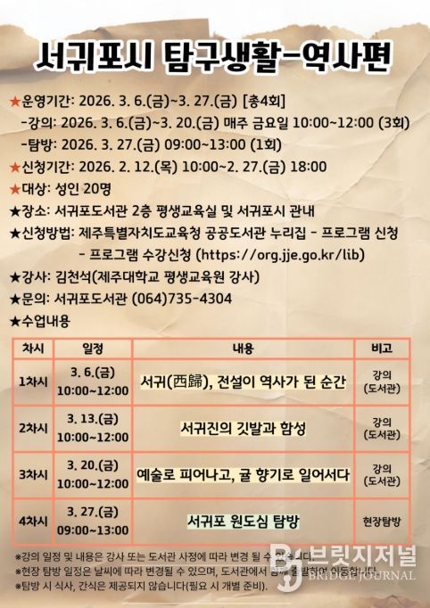 3월 6일·13일·20일 강의는 오전 10시부터 12시까지 서귀포도서관 2층 평생교육실에서 진행되며 4차시 현장 탐방은 3월 27일 오전 9시부터 오후 1시까지 서귀포시 원도심 일원에서 운영된다.