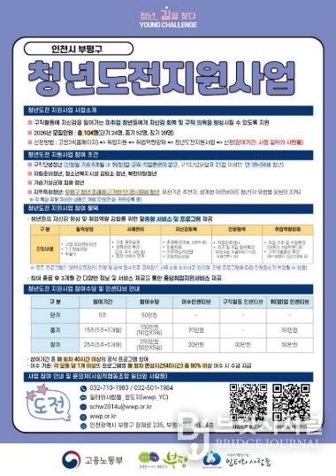 브릿지저널 김경미 기자 | 부평구는 오는 10월까지 구직에 어려움을 겪고 있는 지역 청년들의 사회 재진입을 돕기 위한 ‘2026년 청년도전지원사업’ 참여자를 모집한다고 밝혔다.