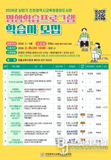 브릿지저널 김경미 기자 | 인천광역시교육청중앙도서관은 주민의 평생교육 기회를 확대하기 위하여 오는 25일부터 ‘상반기 평생학습프로그램’ 학습자를 모집한다