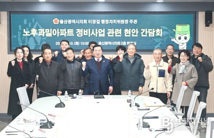 브릿지저널 윤나영 기자 | 울산광역시의회 이장걸 의원(행정자치위원장)이 10일 오전 10시 시의회 2층 회의실에서 노후 과밀 아파트의 재개발·재건축 관련 애로사항을 청취하고 개선 방안을 모색하기 위한 간담회를 개최했다.