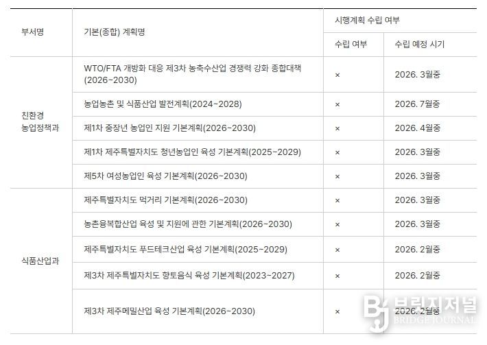 브릿지저널 정보영 기자 | 제주특별자치도의회 농수축경제위원회 한권 의원(더불어민주당/일도1·이도1·건입)은 2026년 2월 10일 개최된 제446회 임시회 농축산식품국 주요업무보고 회의에서, “5년 단위 기본(종합)계획에 의거하여 매해 연도별로 수립되어야 하는 각종 시행계획들이 연초에 제때 수립되지 못함으로서, 의회가 계획의 적정성을 확인하지 못하고, ‘계획도 없이 집행’부터 하는 상황이 초래되고 있어, 개선이 시급하다”고 지적했다.
