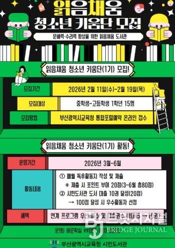브릿지저널 윤나영 기자 | 부산광역시립시민도서관은 올 한 해 동안 어린이와 청소년의 기초 문해력과 수리력 향상, 자기주도적 독서습관 형성을 지원하기 위해 ‘어린이·청소년 읽음채움 도서관’을 운영한다.