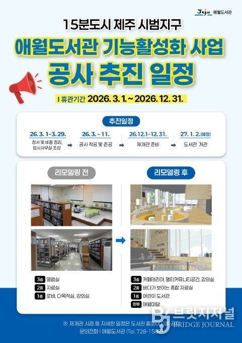 브릿지저널 정보영 기자 | 제주시 애월도서관은 ‘15분도시 도서관 기능활성화 사업’ 추진에 따른 전면 리모델링 공사로 3월 1일부터 12월 31일까지 휴관한다.