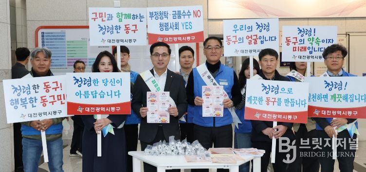이번 캠페인은 박희조 동구청장을 비롯해 감사실과 대전동구공무원노동조합이 함께한 가운데, 명절 전후 자칫 느슨해질 수 있는 공직자의 청렴 의식을 강조하고 투명한 공직사회 분위기를 조성하기 위해 추진됐다.