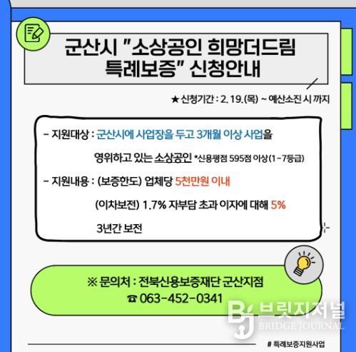 브릿지저널 윤나영 기자 | 군산시가 장기화된 경기 침체와 고물가로 어려움을 겪고 있는 관내 소상공인들의 자생력 강화와 경영 안정을 위해 ‘2026년 소상공인 특례보증 지원사업’을 본격적으로 시행한다.