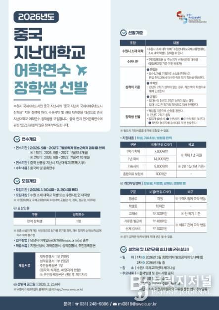 브릿지저널 김경미 기자 | 수원특례시는 2월 20일까지 ‘2026년도 지난대학교 어학연수 장학생 프로그램’ 참가자 1명을 모집한다.