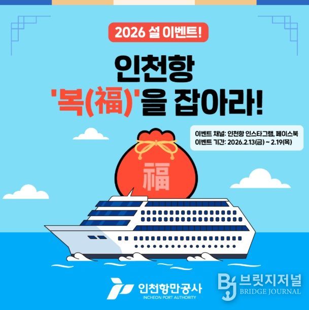 브릿지저널 김경미 기자 | 인천항만공사는 2026년 설 명절을 맞아 공식 SNS 채널(인스타그램, 페이스북)을 활용한 참여형 이벤트 “인천항 복(福)을 잡아라”를 진행한다고 12일 밝혔다.