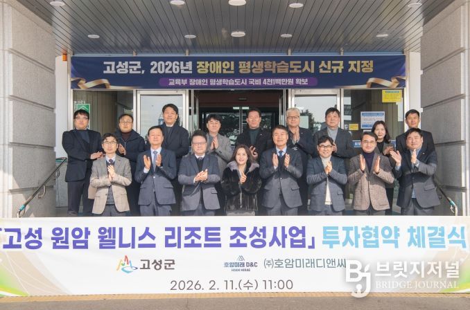 브릿지저널 윤나영 기자 | 평화 경제 거점 도시 강원 고성군은 2월 11일 군청 본관 회의실에서 ㈜호암미래디앤씨(대표 전은영)와 '고성 원암 웰니스 리조트 조성사업' 투자 협약식을 체결했다고 밝혔다.