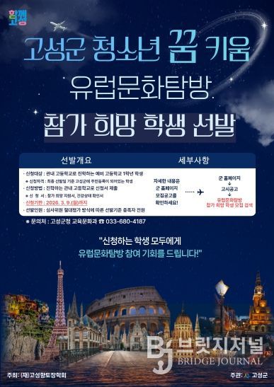 브릿지저널 윤나영 기자 | 평화 경제 거점 도시 강원 고성군의 (재)고성향토장학회는 관내 청소년들에게 국제적 시야를 넓히고 진로 탐색의 기회를 제공하기 위해 '2026년 청소년 꿈 키움 유럽문화탐방' 참가 희망 학생을 선발한다.