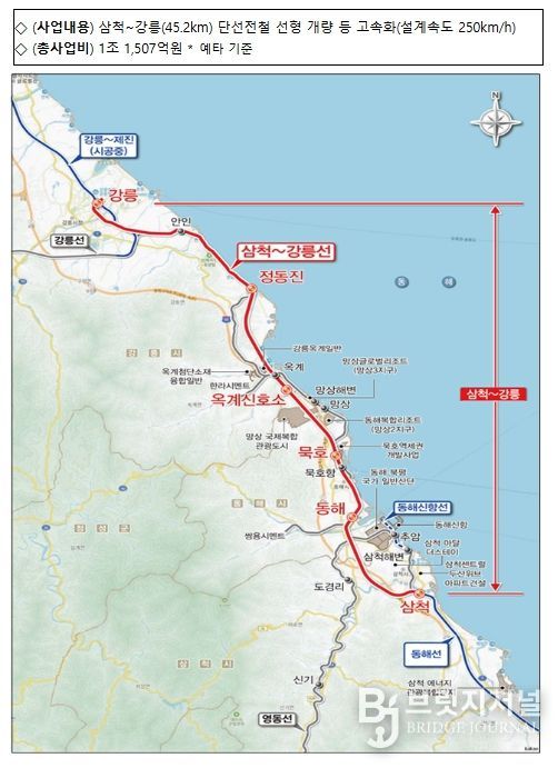 브릿지저널 정보영 기자 | 국토교통부는 2월 12일 동해선 삼척-강릉 철도 고속화 사업과 부산도시철도 정관선 건설사업이 사업 타당성을 확보하여 예비타당성조사를 통과했다고 밝혔다.