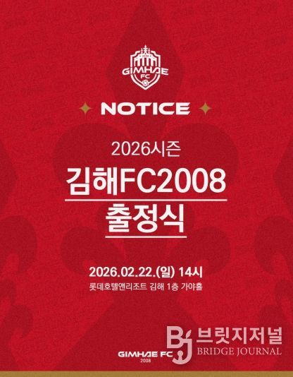 브릿지저널 김경미 기자 | K리그2 무대에 첫 도전장을 내미는 김해FC2008(이하 김해FC)이 오는 22일 오후 2시, 롯데호텔앤리조트 김해에서 ‘2026시즌 출정식’을 개최한다.