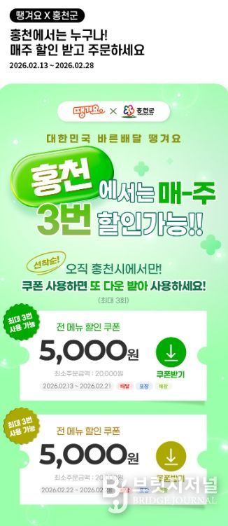 브릿지저널 윤나영 기자 | 홍천군이 비상경제대책의 일환으로 지역 내 소상공인 매출 확대와 소비 촉진을 위해 신한은행의 공공배달앱 ‘땡겨요’와 손잡고 실질적인 지원에 나선다.
