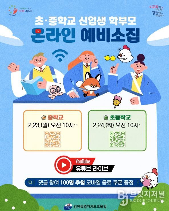 브릿지저널 윤나영 기자 | 강원특별자치도교육청은 23일과 24일 오전 10시 유튜브 생방송으로 ‘초·중학교 신입생 학부모 온라인 예비 소집’을 진행한다.