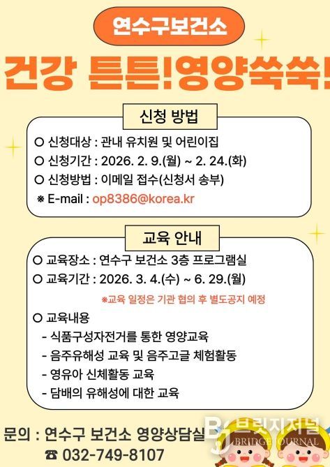 브릿지저널 김경미 기자 | 연수구보건소는 오는 3월부터 지역 내 어린이집과 유치원 원아를 대상으로 올바른 식습관 형성과 건강한 생활 습관 정착을 위해 2026년 ‘건강 튼튼! 영양 쑥쑥! 어린이 교실’을 운영한다.