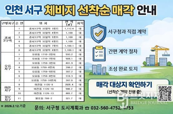 브릿지저널 김경미 기자 | 인천 서구는 도시개발구역·구획정리사업지구 내 체비지 잔여 물량 17필지를 선착순 수의계약 방식으로 매각한다고 밝혔다.