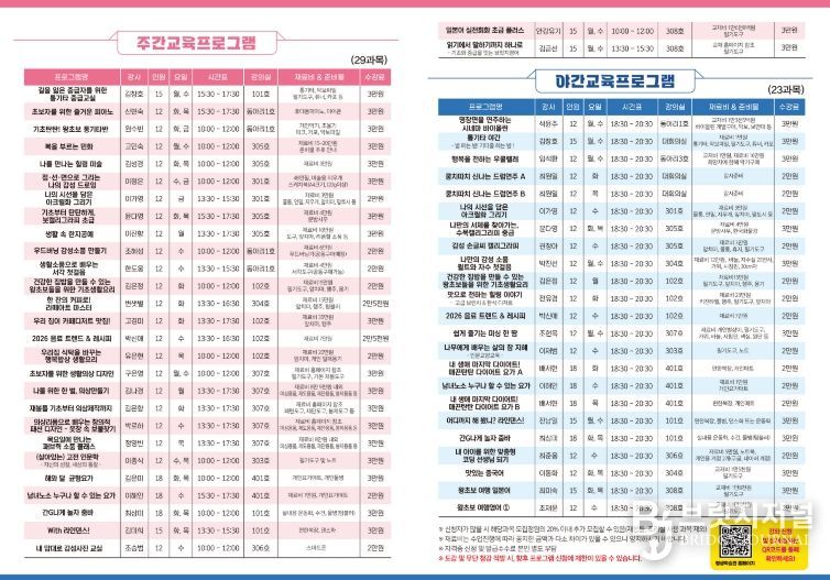 특히 이번 프로그램은 특정 분야에 편중되지 않도록 문화·취미·실생활 역량을 고르게 아우르는 균형있는 구성에 중점을 두었다. 기존 인기 강좌는 안정적으로 운영하는 한편, 다양한 신규 강좌를 함께 편성해 군민들의 선택 폭을 넓혔다.